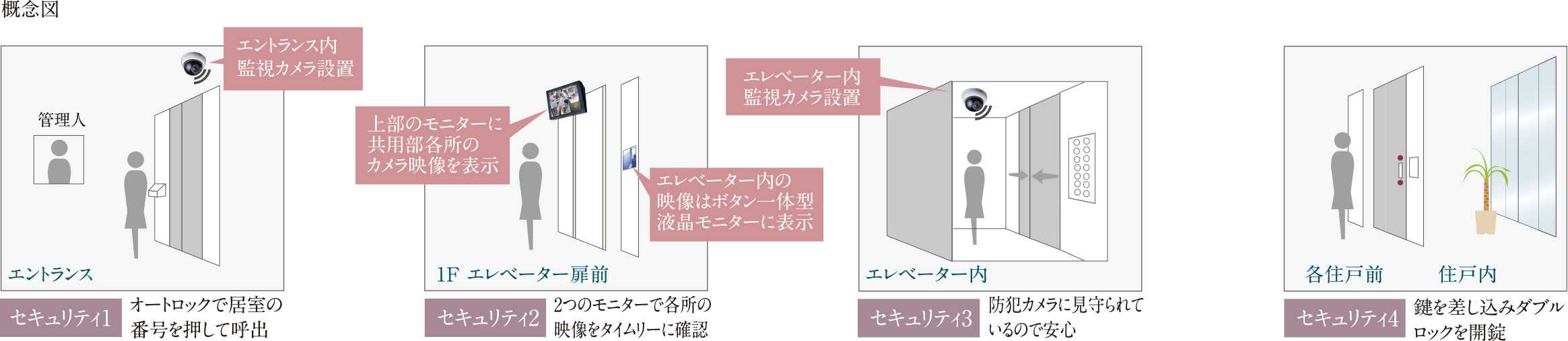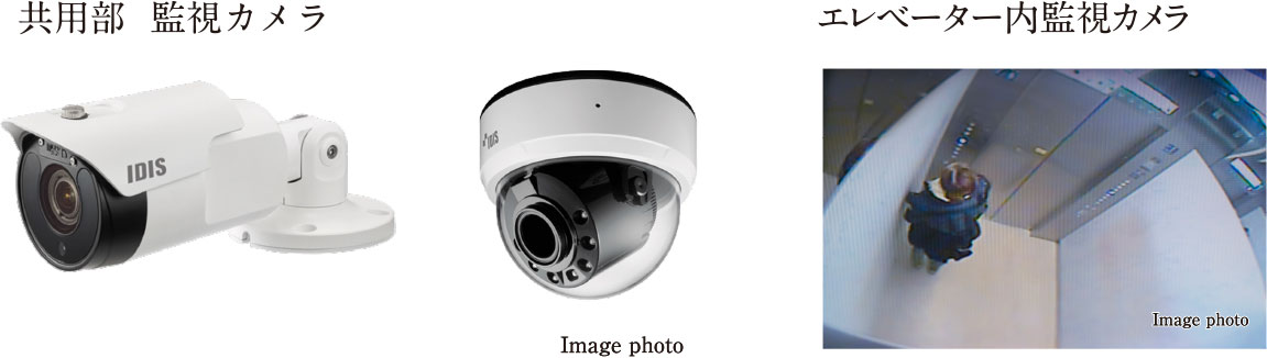 いたずらや犯罪を抑止するために、駐車場、エントランスホール、エレベーターなどに監視カメラを設置。1階エントランスにあるモニターでの確認や管理室でも確認可能となっています。