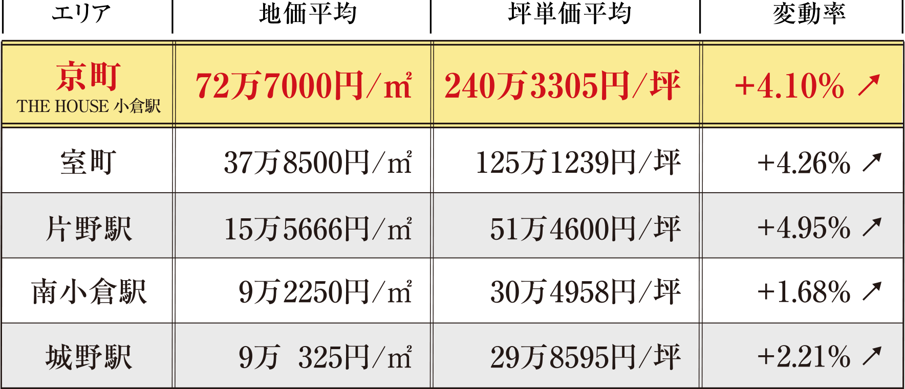 小倉北区京町の地価の総平均(公示地価、基準地価の平均)は72万7000円/㎡(2025年[令和7年])、坪単価では240万3305円/坪です。前年からの変動率の平均は+4.10%の上昇。北九州市の地価で最も高い数値を更新しております。