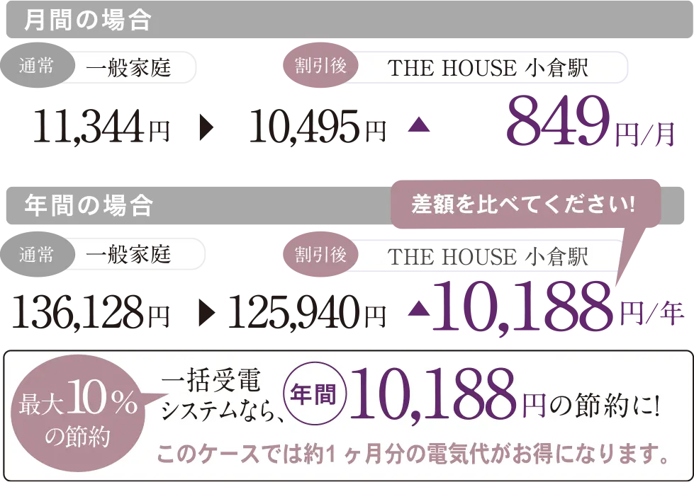 一般家庭の低圧受電契約と、大口の業務用の高圧受電契約とでは、電気料金に格差があります。一般家庭は、使用電力の多い施設に比べ、割高の電気料金を支払っているのです。「一括受電システム」は、マンション1棟全体をひとつの事業所とみなし、電力会社と高圧受電契約を結ぶことで、各ご家庭に割安な電気を供給し、電気料金の削減を実現します。