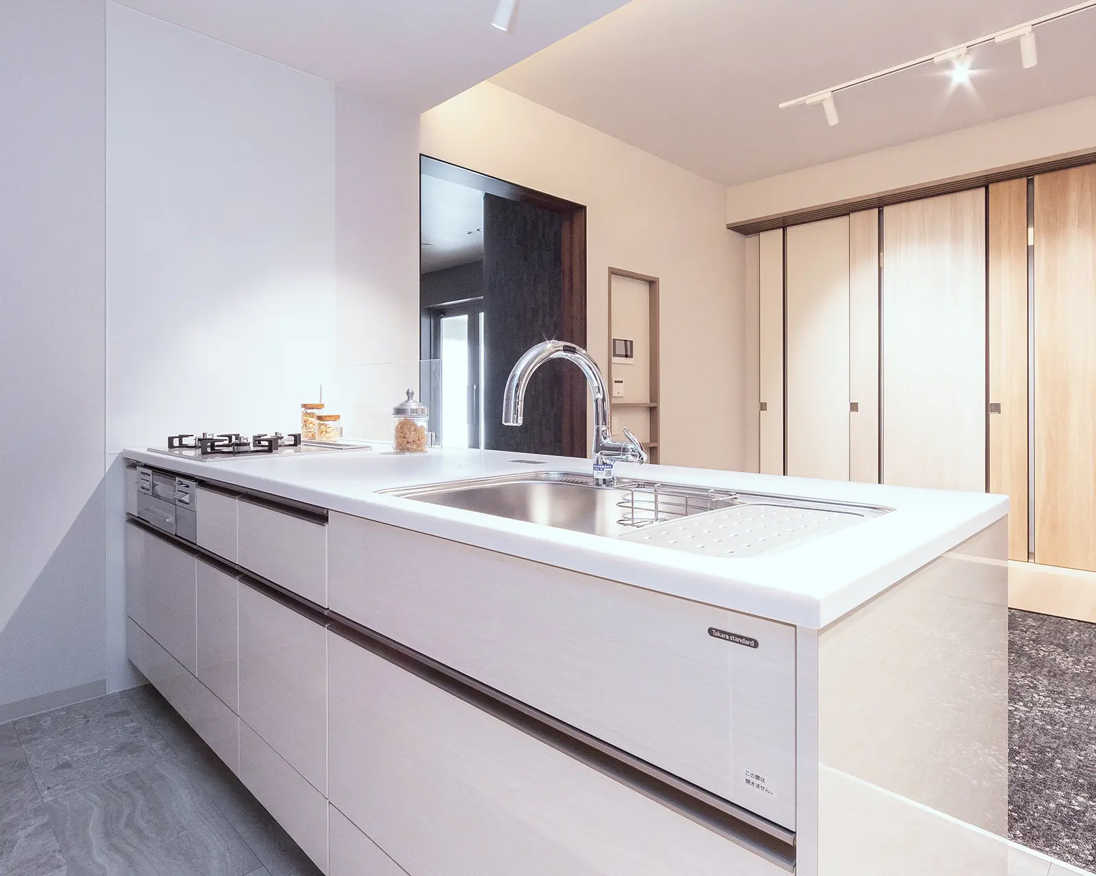 スッキリとした見た目でリビング家具との相性もよく、キッチンがより周囲のインテリアに溶け込みやすいデザインとなっております。