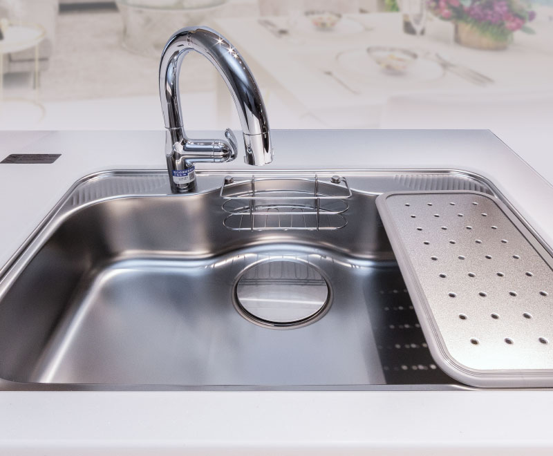 幅770mm×奥行き490mmの大型シンク。シンク裏に貼ったシートが、お皿のあたる音やシャワー水栓の水はね音などを抑えてくれます。