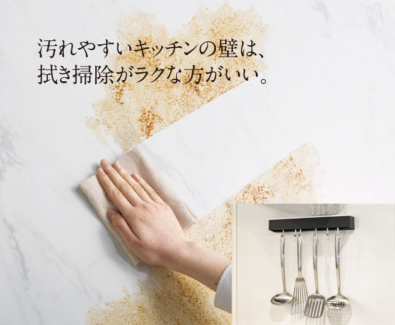 コンロ近くの油ハネで汚れやすいキッチンパネルは、高品位ホーローを採用。頑固な汚れもサッと拭き取るだけでキレイになります。