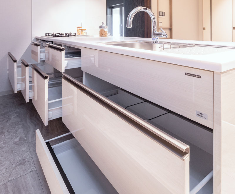 静かにゆっくりと閉まるソフトクロージング機能の引き出しを設置。奥まで引き出せるので、スペースの有効活用により、収納量も大幅にアップしました。