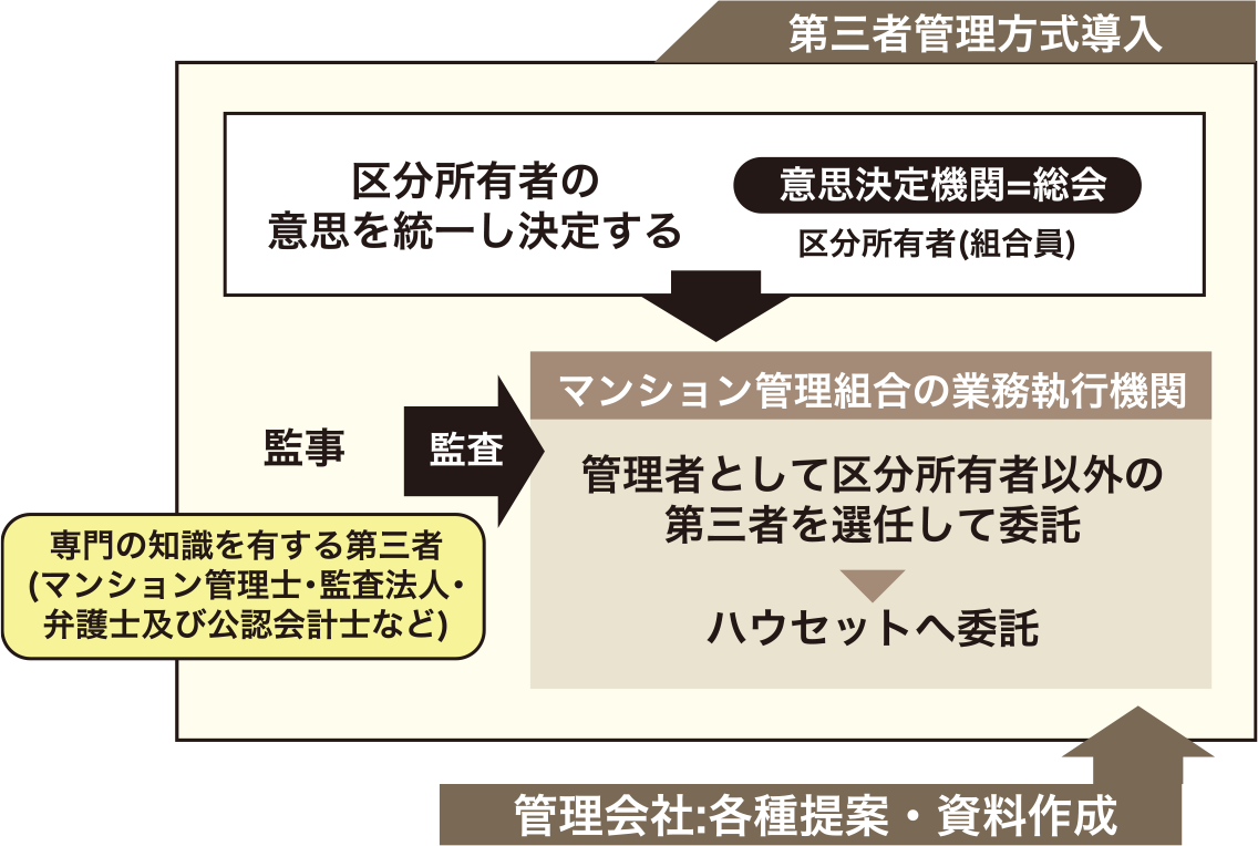 理事のなり手不足や、時間的負担の解消を背景に、管理会社であるハウセットに理事会業務(組合運営業務)を委託できる第三者管理方式を採用しています。プロならではの知見で、共用部分の修繕検討や長期修繕計画などをご提案し、最小限のご負担で適正な管理を実現します。