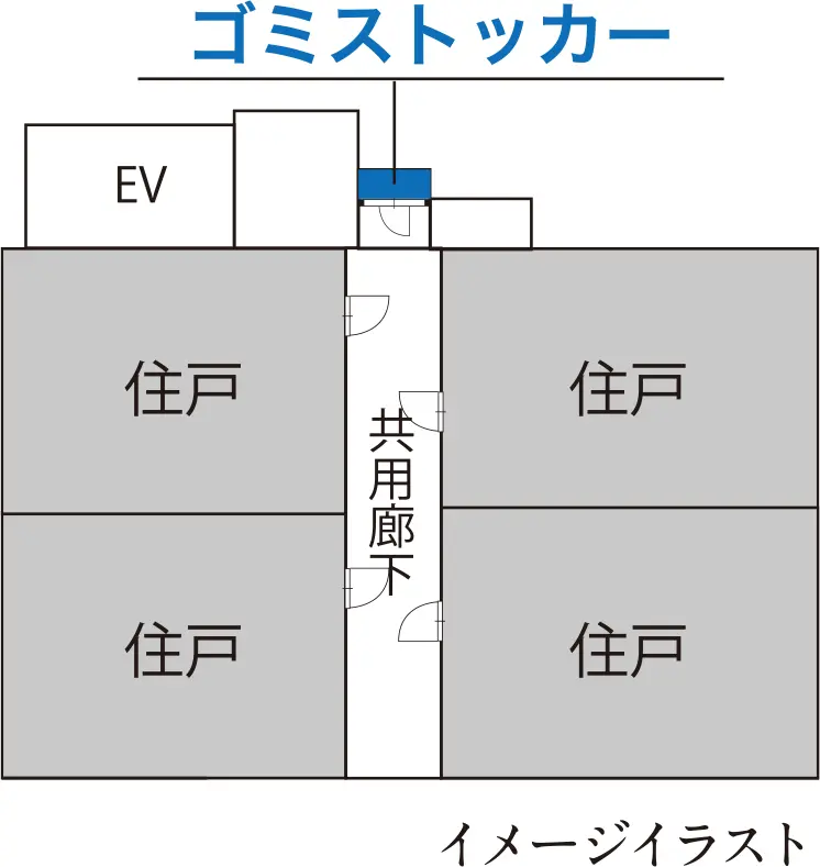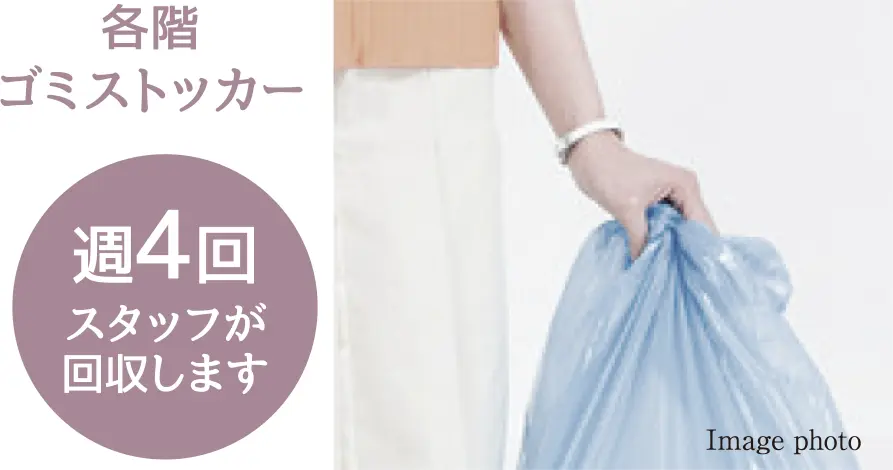 ゴミは指定の時間までに北九州市の指定袋に入れて各階の各階ゴミストッカーに入れていただくだけで、清掃員が回収し、1階の総合ゴミ置場へ搬入するサービスを実施しています。