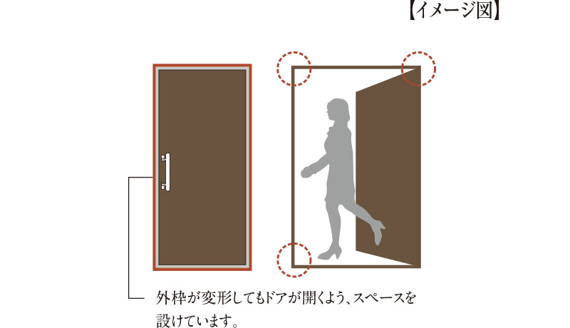 玄関ドアの枠が地震によって変形し開閉できなくなる事態に備えて、耐震枠を導入。ドアと枠の間にスペースが確保され、変形してもドアの開閉が可能です。