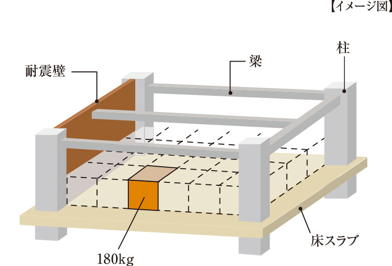 180kg/㎡(1㎡に180kgの荷物を隙間なく置いた状態)の重さにも耐えられる強度の高い床構造。