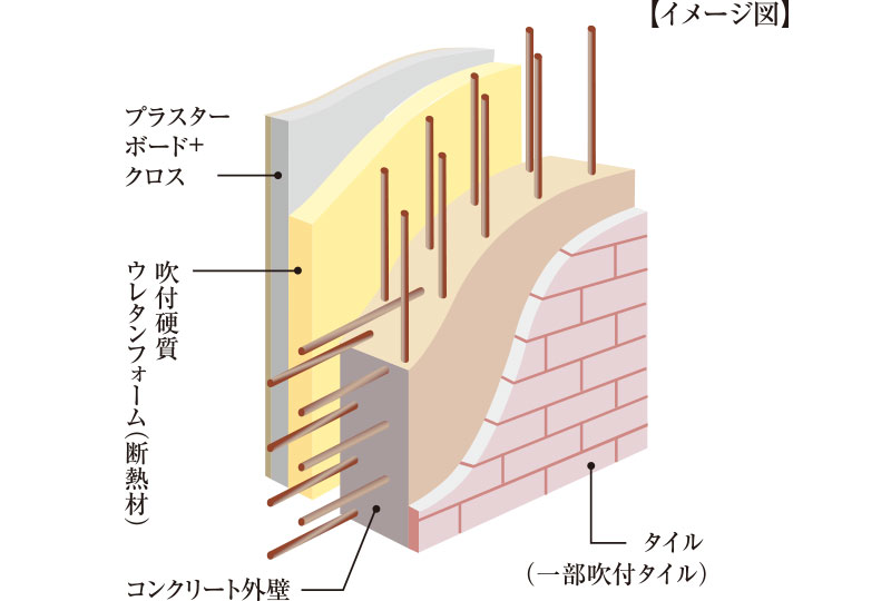 外壁は厚み150㎜のダブルチドリ配筋コンクリート構造で内側に吹付け硬質ウレタンフォーム断熱材50㎜とプラスターボードを採用し、より断熱性・遮音性を高める構造としました。