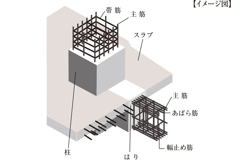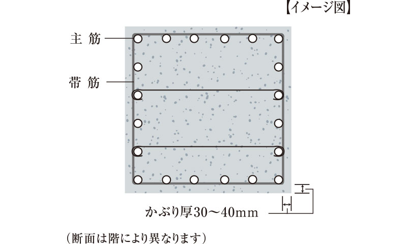建物の柱主筋を巻く鉄筋(帯筋)には、H型フープを採用し、柱の粘り強さを高めています。また、主要構造部である基礎柱・梁に27〜39N/m㎡のコンクリートを採用しました。緻密で劣化しにくい耐久性の高いコンクリートです。