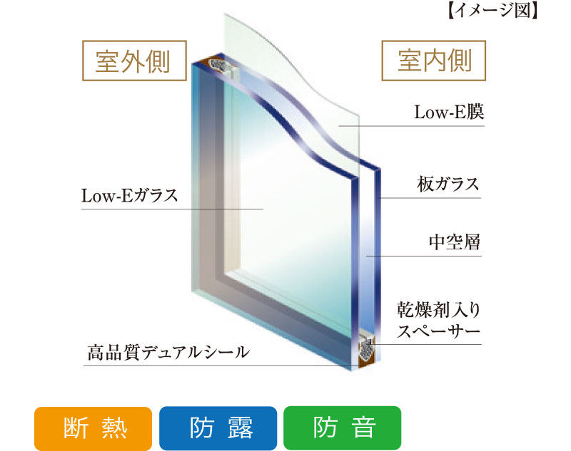 ガラスの間に空気層を挟み、断熱性を高めて結露防止に配慮した複層ガラスを採用。