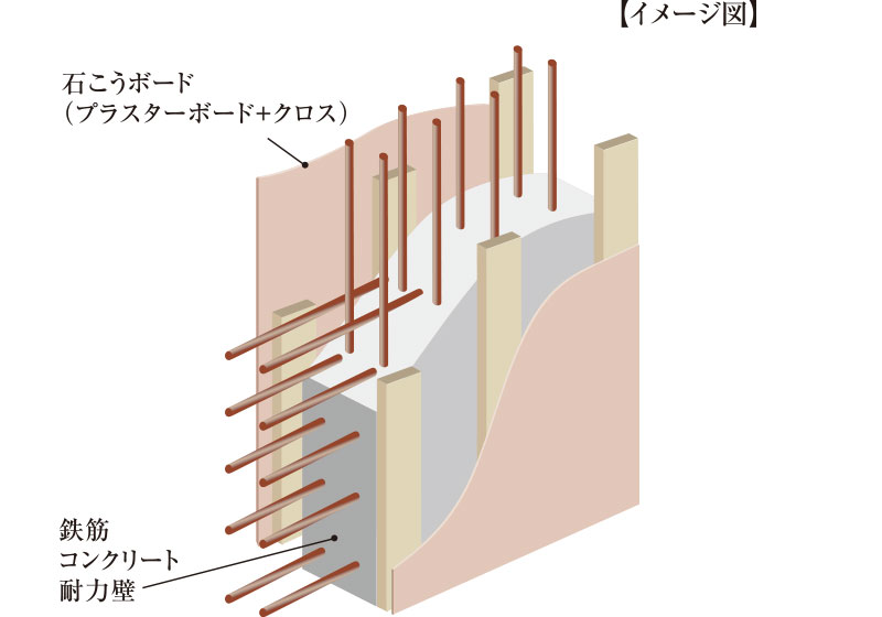 各住戸境の耐力壁は厚み200mm〜350mmのダブル配筋コンクリート構造となっています。シングル配筋に比べて高い構造強度、並びに耐震性を実現しています。。
